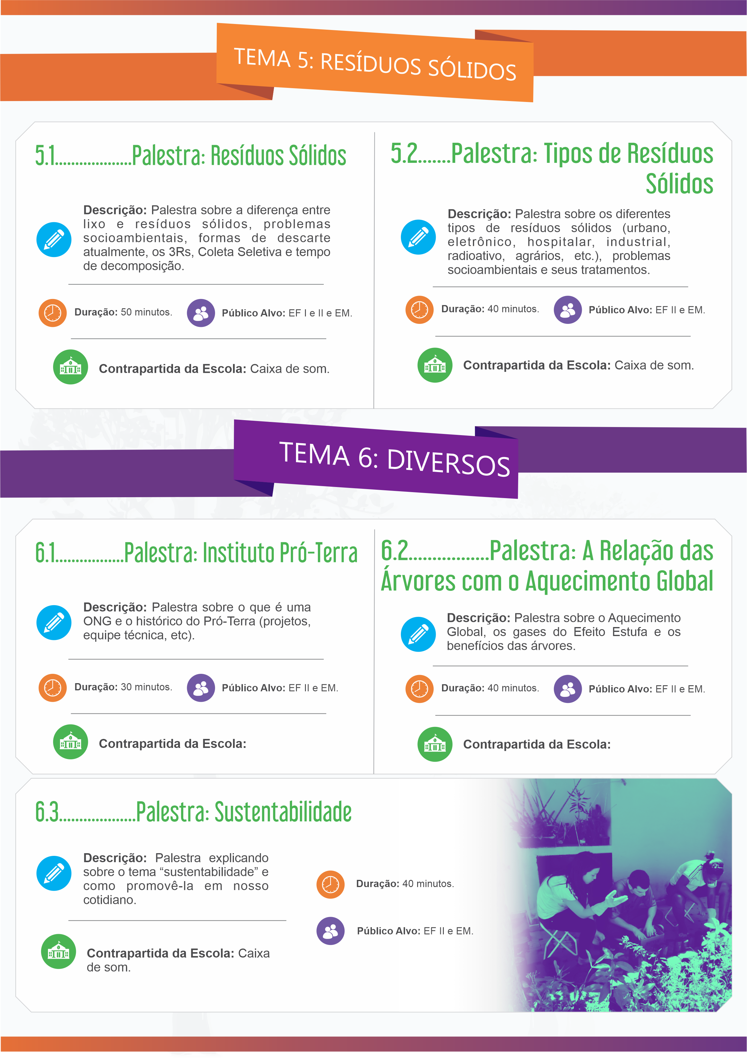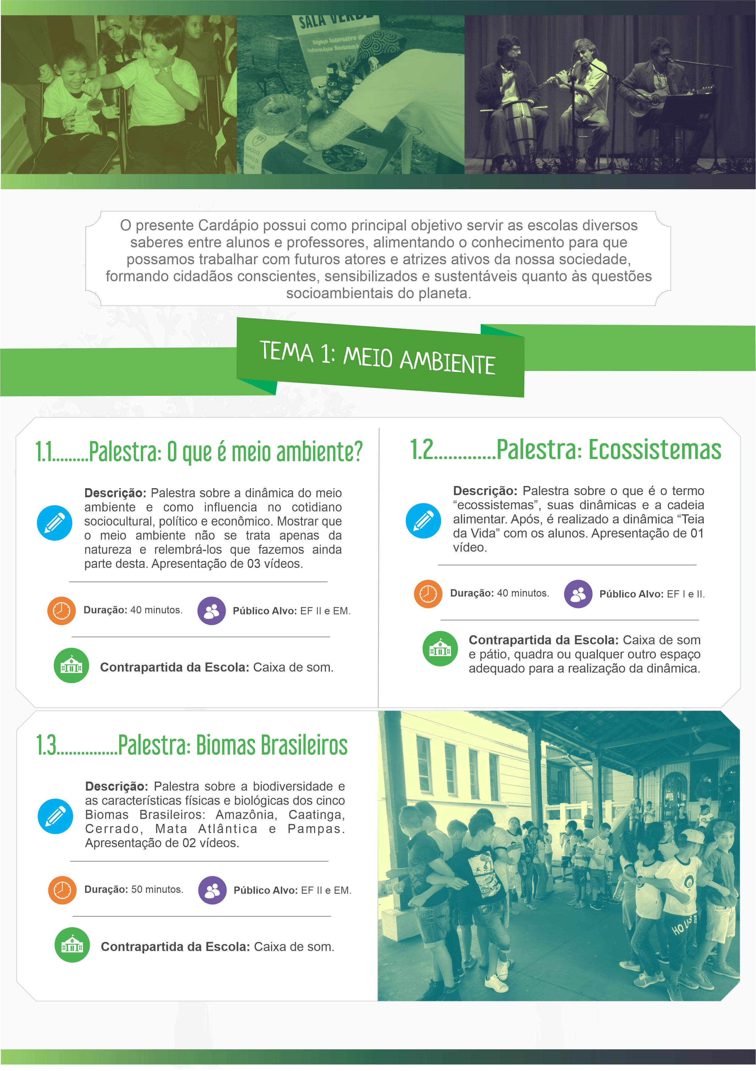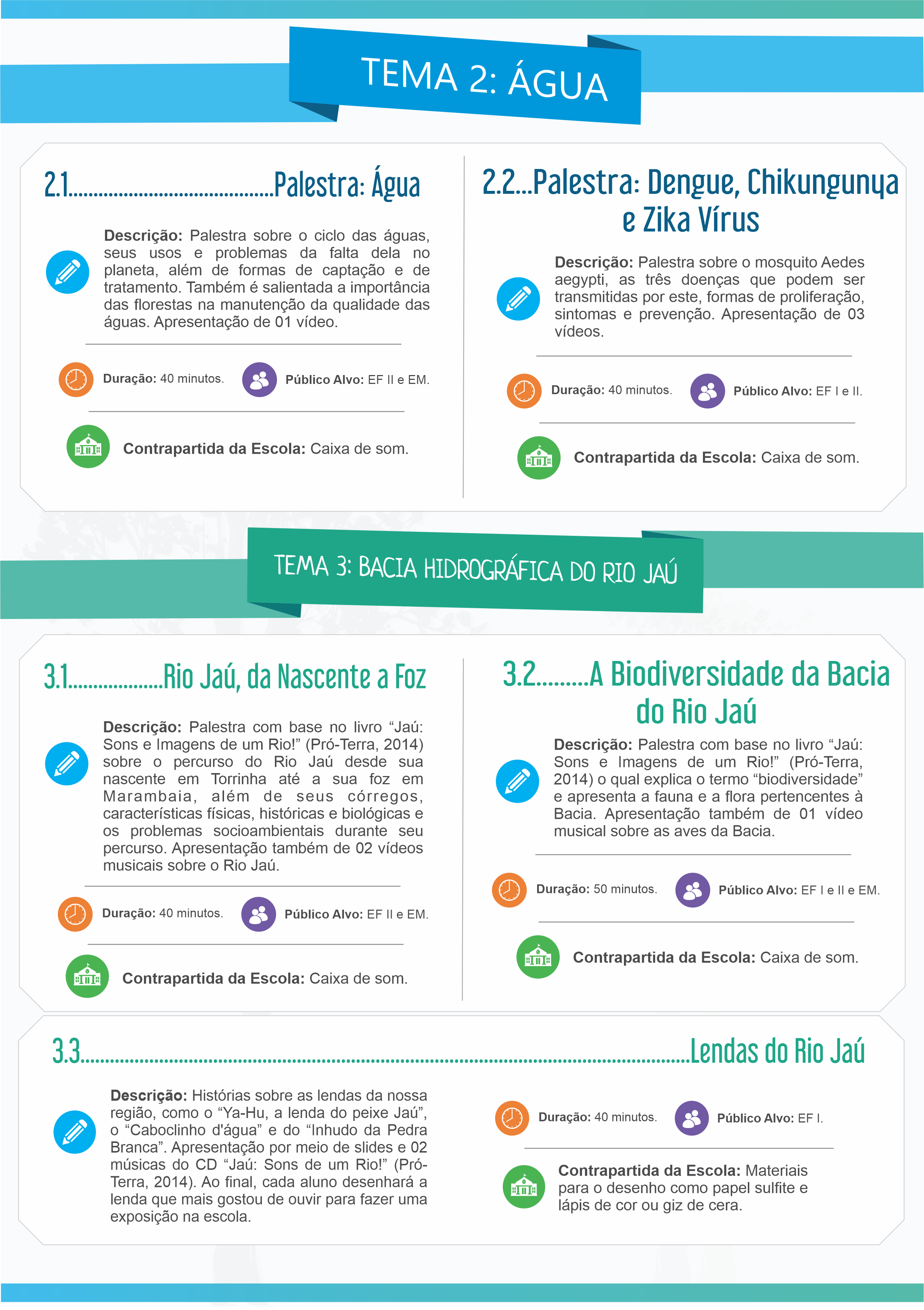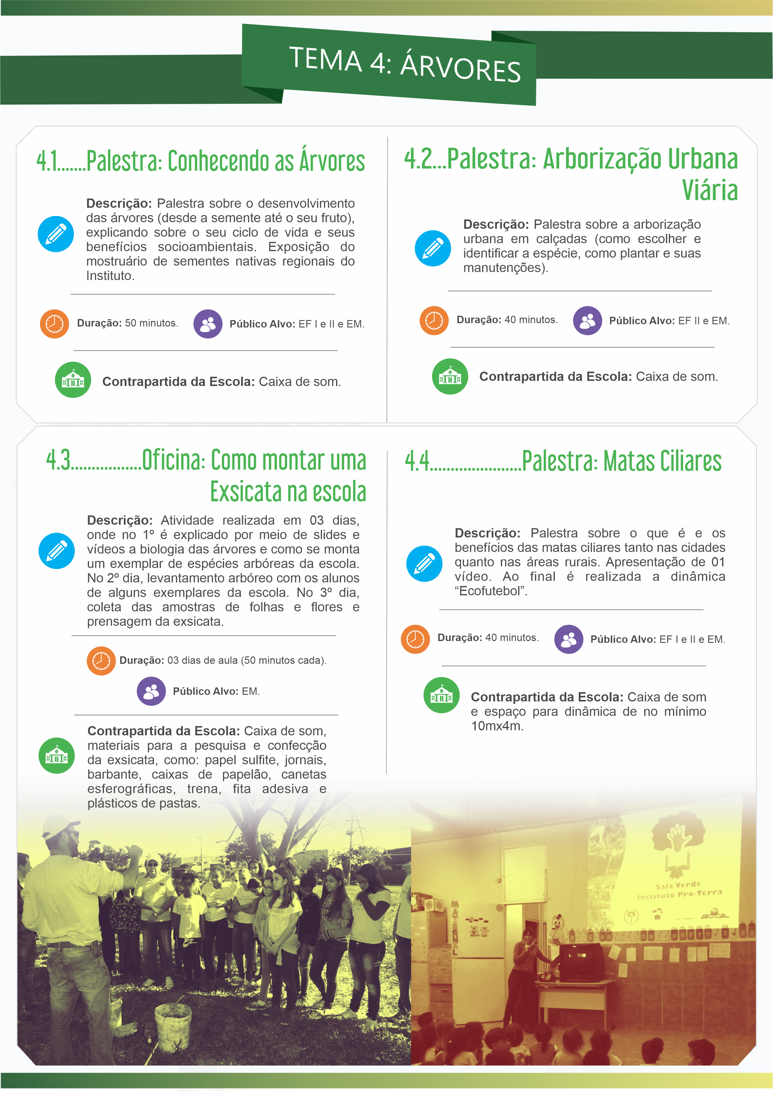 Dentre as principais ações realizadas pela Sala Verde Instituto Pró-Terra, contamos com o “Cardápio de Atividades da Sala Verde Instituto Pró-Terra” (figura 1) para serem realizadas nas próprias instituições de ensino (privadas ou publicas). Tais ações incluem palestras, dinâmicas e oficinas de trabalhos divididas em seis (06) temas: Meio Ambiente, Água, Bacia Hidrográfica do Rio Jaú, Árvores, Resíduos Sólidos e Diversos (Sustentabilidade, Gênero, etc.), todas voltadas para alunos do Ensino Fundamental I e II e Ensino Médio. Ressaltamos que dentre as atividades do Cardápio, também doamos obras voltadas a Educação Ambiental e ao meio ambiente para as Salas de Leituras das escolas.