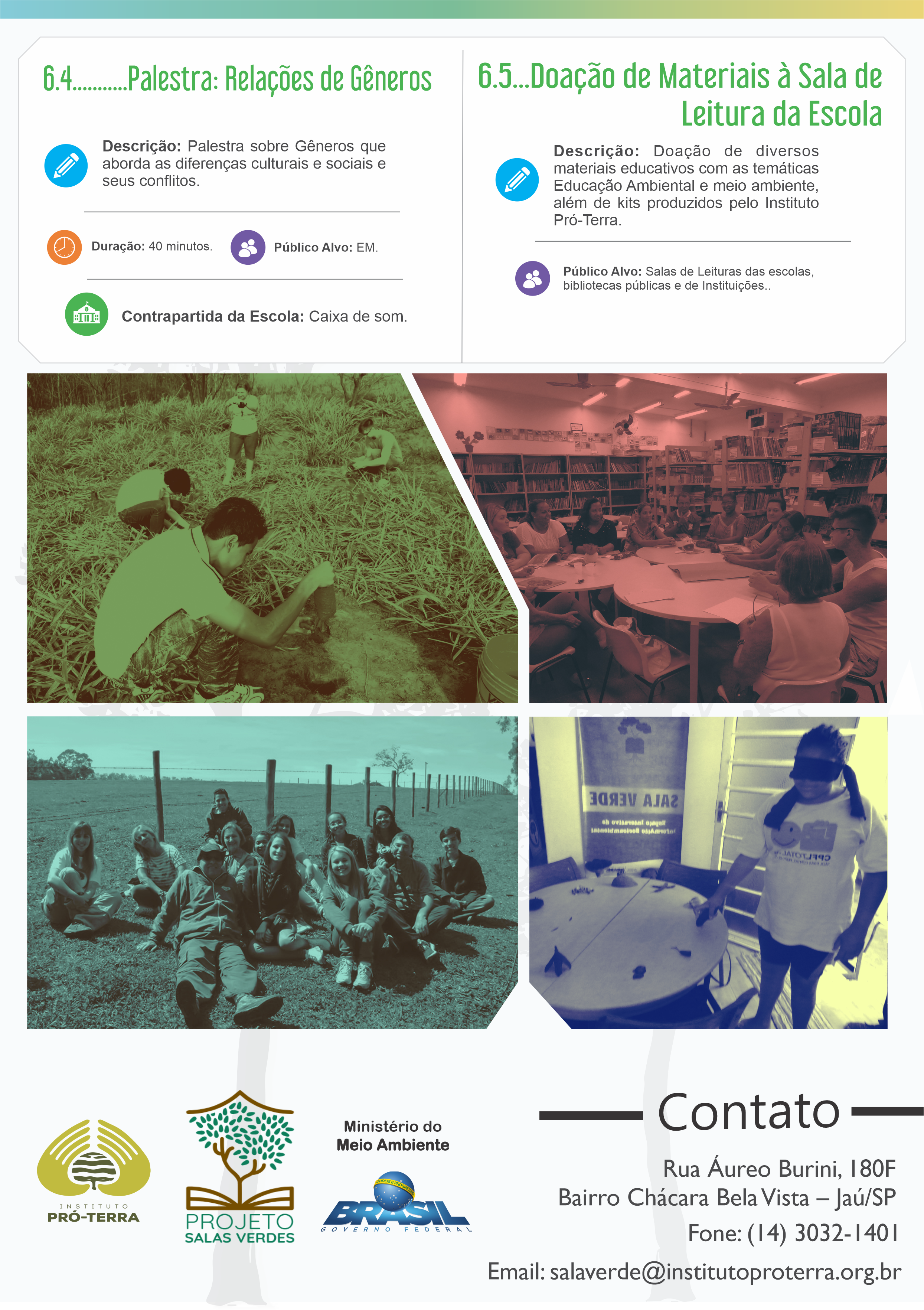 Para realizar o agendamento das atividades é necessário entrar em contato através do nosso telefone ou pelo e-mail salaverde@institutoproterra.org.br solicitando uma ou mais ações.